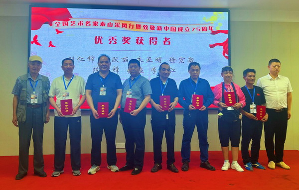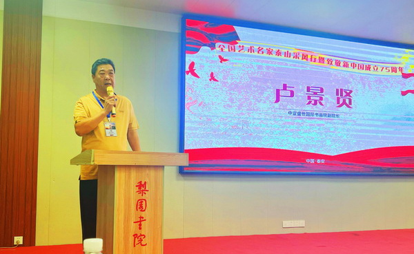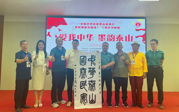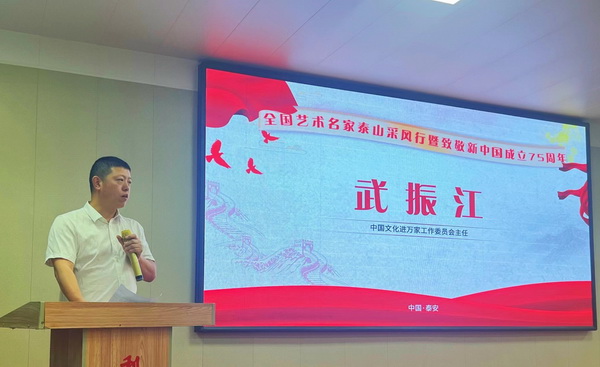 國際數(shù)字傳媒港北京電 日前,通過實(shí)地探訪祖國大好河山,立足于泰山景區(qū)獨(dú)特文化稟賦,感受其雄偉壯麗的自然景觀與深厚的歷史文化底蘊(yùn),從而激發(fā)藝術(shù)家的創(chuàng)作靈感,6月30上午,由北京中宣盛世國際書畫院主辦,泰山梨園書院、中國民間手工藝發(fā)展委員會、中華詩詞學(xué)會長陽圖書館、中國食品聯(lián)盟、人民藝宣網(wǎng)、作家報(bào)、中國人物邦網(wǎng)支持舉辦的“愛我中華 墨韻泰山”全國藝術(shù)名家泰山采風(fēng)行暨致敬新中國成立75周年書畫作品展”在泰安拉開帷幕,中宣部原工會主席齊殿清主席宣布書畫展開幕。