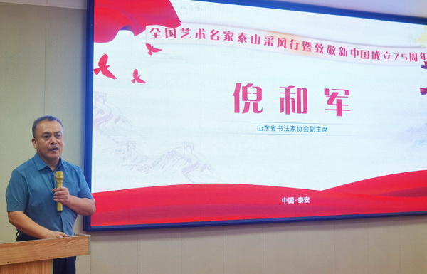 倪和軍主席在致辭中表示,熱烈歡迎中宣畫院藝術(shù)家代表來到泰安采風(fēng)舉辦展覽和采風(fēng)活動,并向到場嘉賓介紹了泰安自然風(fēng)光以及泰山人文景觀,尤其是泰山的碑刻文化,歷史悠久、豐富多彩,非常值得大家親自登山現(xiàn)場觀摩學(xué)習(xí),希望大家通過此次活動對泰山文化、泰山書法有更加深刻的了解和體會,并把感受創(chuàng)作到書法作品中去,用藝術(shù)形式把泰山文化精神內(nèi)涵傳播的更加長遠(yuǎn),最后祝書畫展圓滿成功。