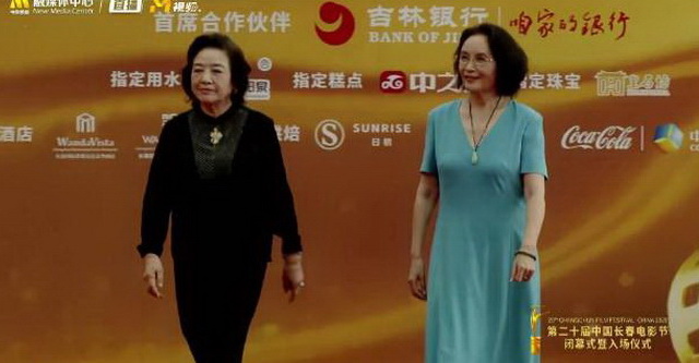 第二十屆中國(guó)長(zhǎng)春電影節(jié)閉幕式致敬老藝術(shù)家肖桂云(左)和宋曉英亮相