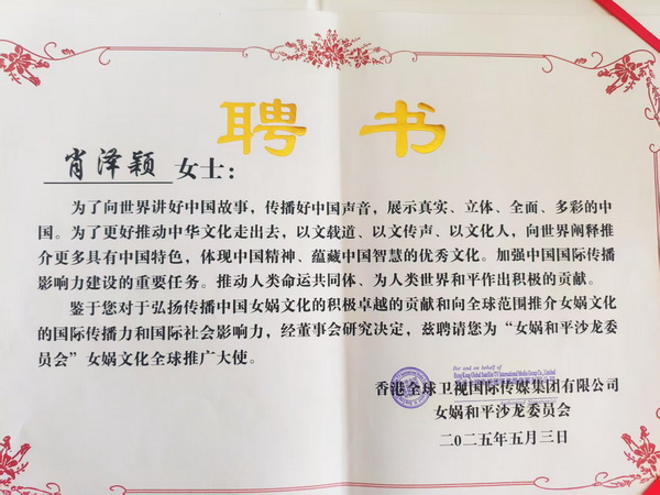 鑒于著名女作家及資深談話類主持人肖澤穎對于弘揚傳播中國女媧文化的積極卓越的貢獻和向全球范圍推介女媧文化的國際傳播力和國際社會影響力,2025年5月3日,“女媧和平沙龍委員會”和香港全球衛(wèi)視國際傳媒集團共同授予肖澤穎擔任女媧文化全球推廣大使。在全球范圍及一帶一路沿線國家全面推介女媧文化。